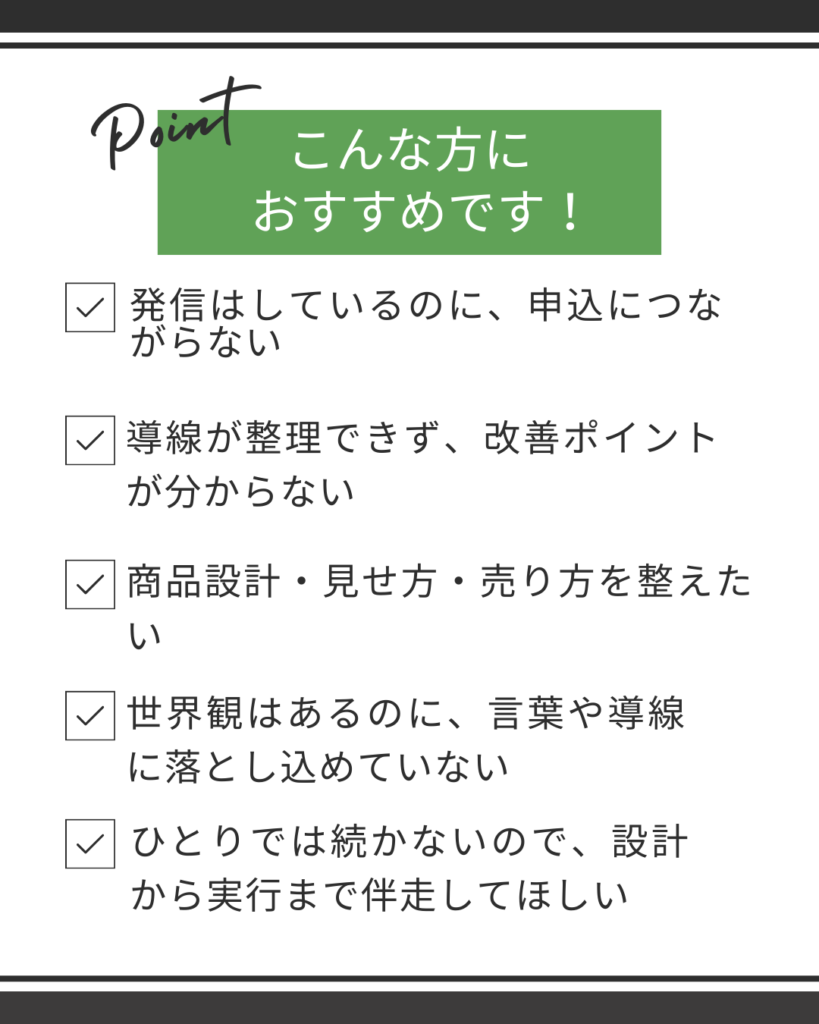 集客〜申込〜売上〜リピートまでを、戦略として設計しながら育てていきます。